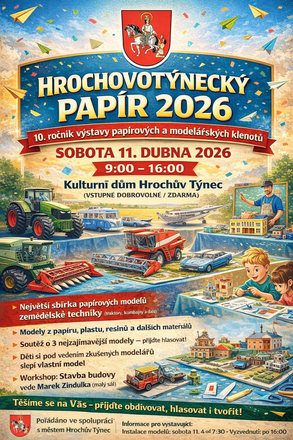 Desátý ročník výstavy modelů Hrochovotýnecký papír 2026. K vidění pro návštěvníky bude sbírka papírových modelů zemědělské techniky a dalších žánrů. Dále budou prezentovány modely z plastu, resinů a dalších materiálů.