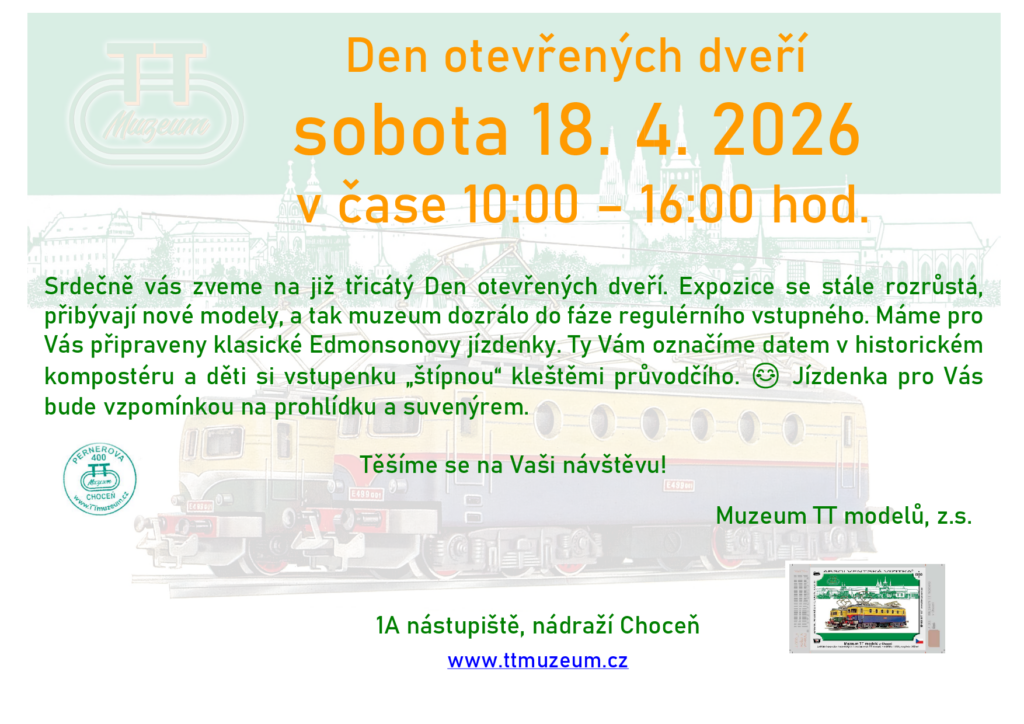 Den otevřených dveří Jsou nahlášeny významné návštěvy, mezi nimi např. modeláři z SPŽ Bělkovice přijedou předat muzeu dar, zimní TT diorámu. LetákZimní TT diorámaZdrojMísto konání: Choceň