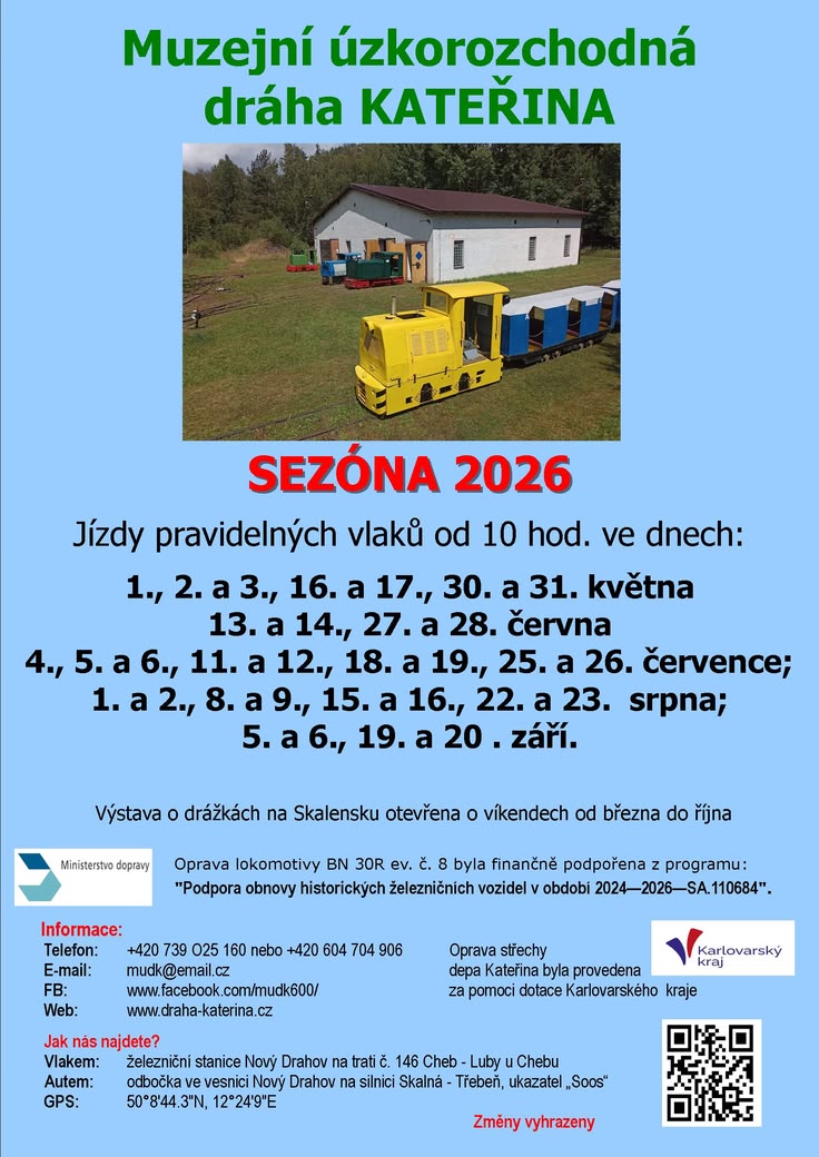 Pravidelné jízdy muzejní úzkorozchodné dráhy Kateřina ve vybraných víkendech a svátcích během sezóny 2026. Výstava o drážkách na Skalensku.